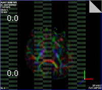 The color coded DTI map (side unreversed)shows the same finding. Note that the area of 'void' in the tractography images seen above shows a collection bunch of diferent colors ( mainly purple) indicating a loss of coherent anisotropy