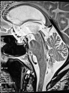 Findings: Triventricular dilatation out of proportion to atrophy with periaqueductal hyperintensity, large jet of flow void in the aqueduct and fourth ventricle, periventricular hyperintensity, upward ballooning of corpus callosum, posterior gyri opposed aginst the calvarium, CSf pocket in medial sulcus